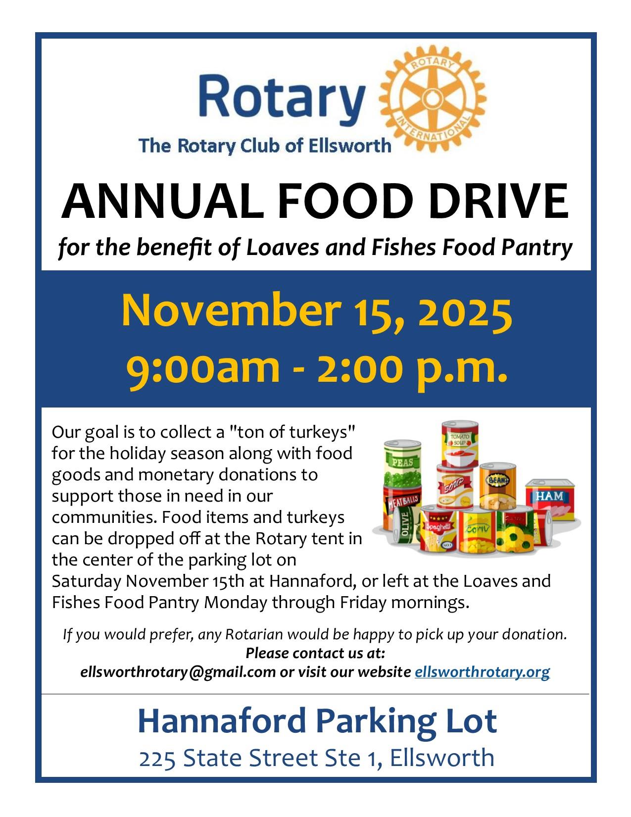 The Rotary Club of Ellsworth will be conducting their annual Food Drive for the Loaves and Fishes Food Pantry in Ellsworth on Saturday, November 15th from 9am to 2pm at the Ellsworth Hannaford. We accept food or monetary donations at this event to help those in need in Hancock County.